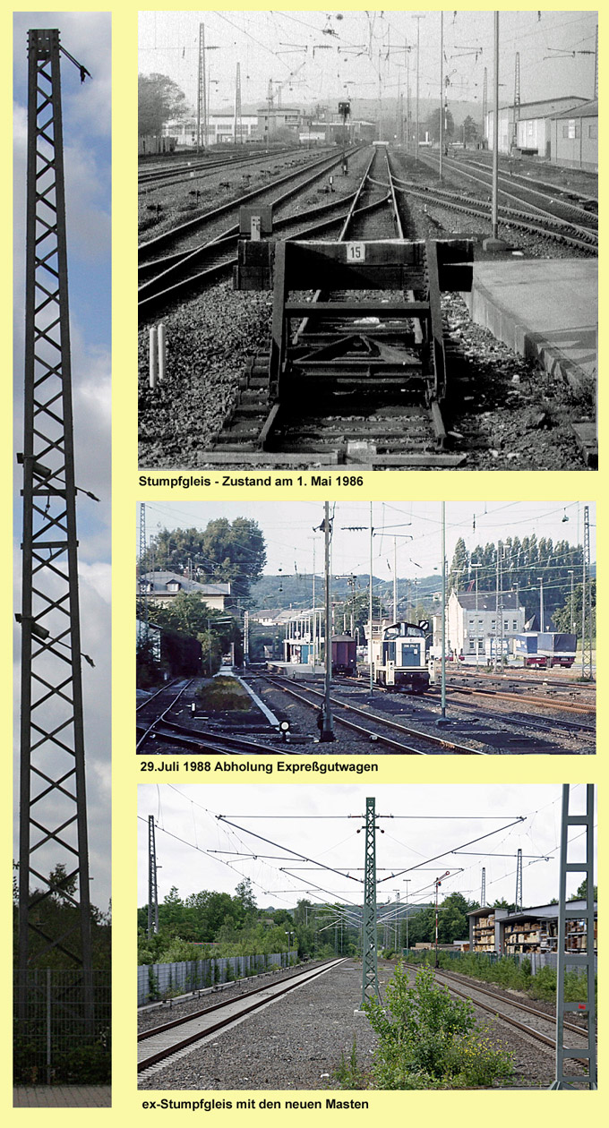 Die Mittelmasten stehen auf der Fläche, die früher einmal zwei Stumpfgleisen diente. Gleis 13 (NL 160 m Richtung Düsseldorf, konnnte zur Abstellung eines S-Bahnzuges genutzt werden, bzw. ermöglichte den Wechsel von Gleis 1 auf 2 bzw. anders herum. Der kurze Gleistumpf vor dem Bahnsteig ( NL 13 m) wurde für den Expreßgutwagen mit "eigenem Bahnsteig" genutzt. |