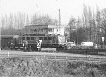 | links: Eine Lok der BR 140 mit dem Expressgutwagen am Bahnübergang Schwarzbachstrasse auf dem Weg Richtung Düsseldorf. |